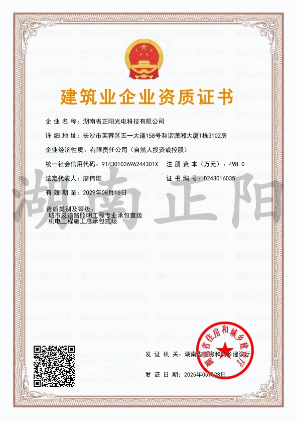 湖南省正陽光電科技有限公司是一家從事亮化工程及大型燈光藝術的設計、制作、安裝和維護于一體的專業(yè)化公司。公司資質齊全、管理嚴謹、技術先進、實力雄厚,取得了城市及道路照明工程專業(yè)承包壹級資質、照明工程設計專項甲級資質、機電工程施工總承包貳級資質、施工勞務等資質,榮獲“重質量·守誠信”示范企業(yè)。